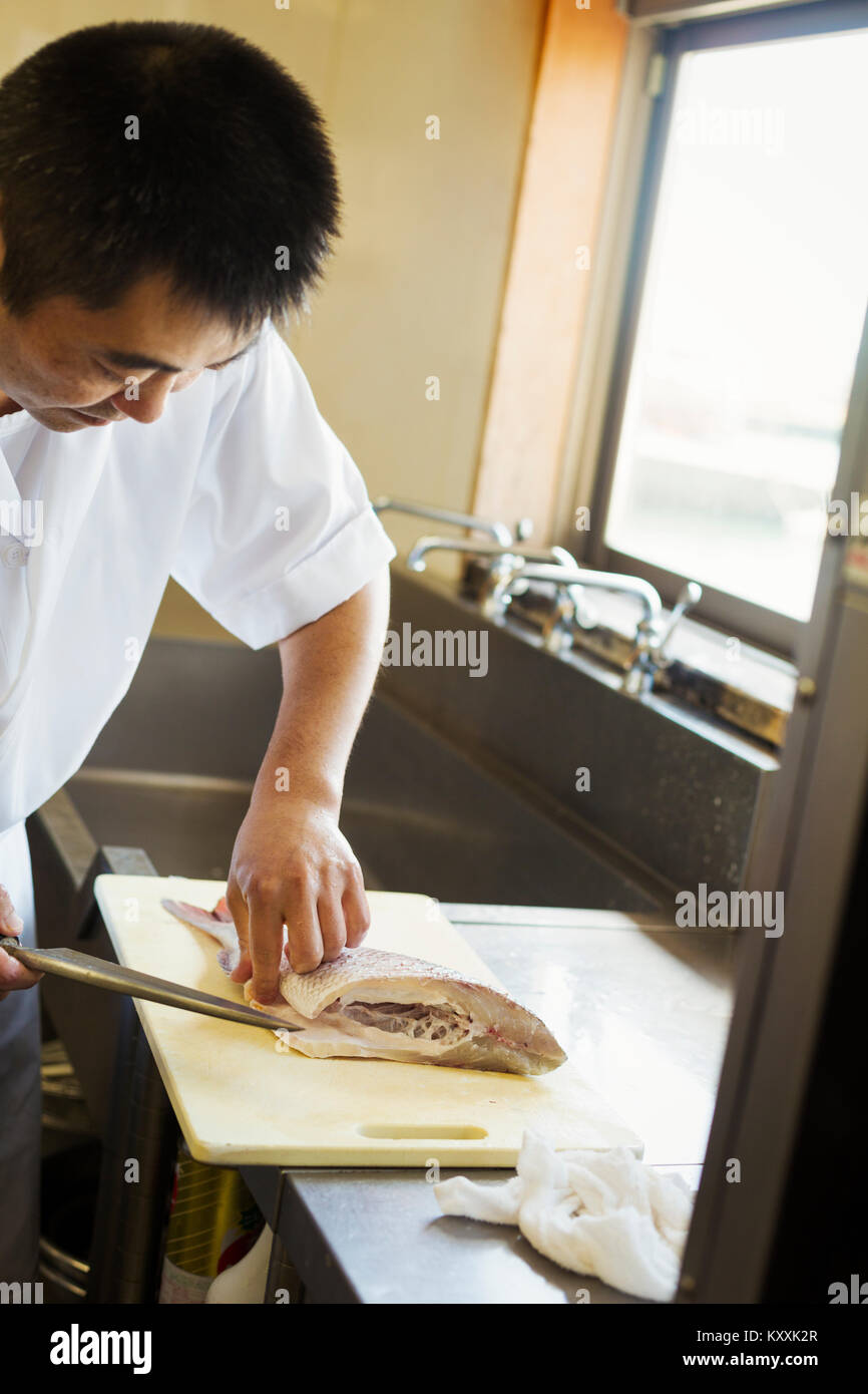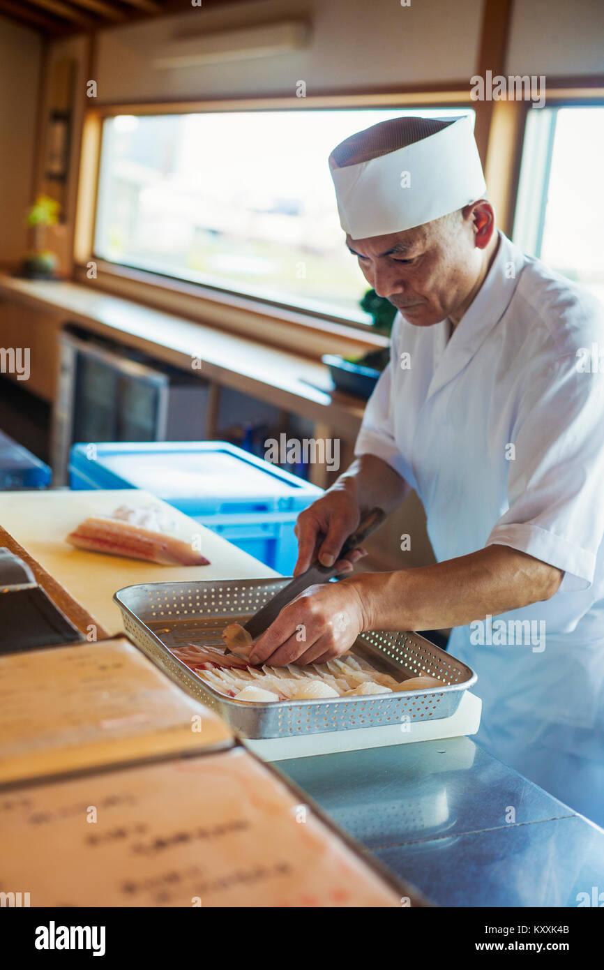 Chef Working At A Counter At A Japanese Sushi Restaurant Slicing