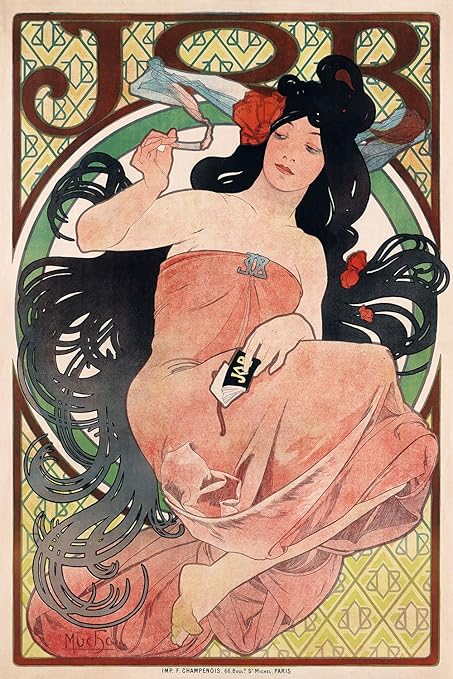 A beautiful woman with a lighted cigarette dominates muchas poster the rising smoke intertwining with her swirling pre raphaelite hair and the job logo. Alphonse muchas poster for job cigarette papers is one of the most famous works in design history. In 2008 the company commissioned stuckist artist paul harvey to create a campaign series of posters with a stylistic reference to alphonse mucha.