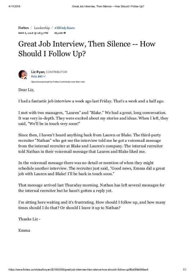 Write a thank. Here is the right way to follow up on a job interview without being a pest 1. Its hard to figure out how often you should follow up with your.